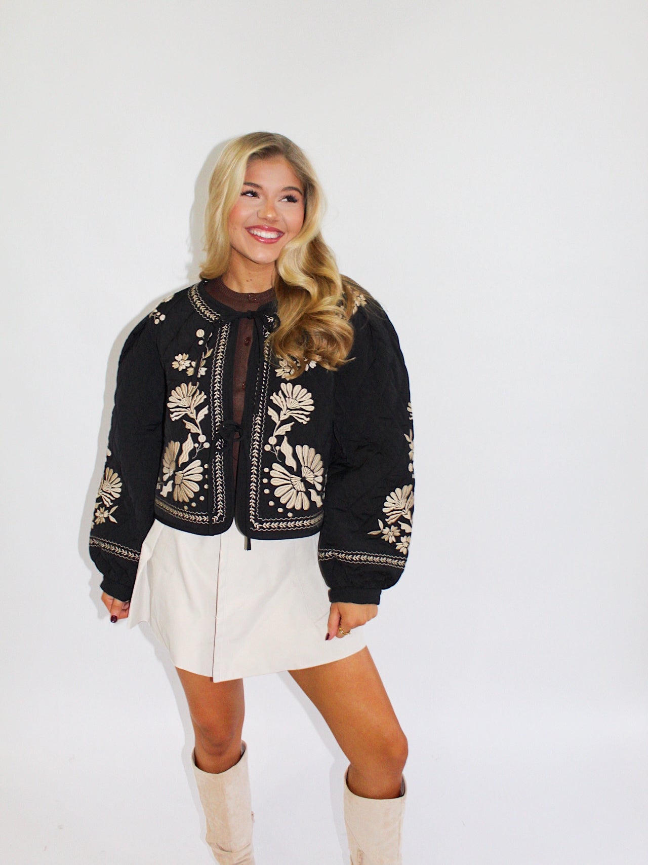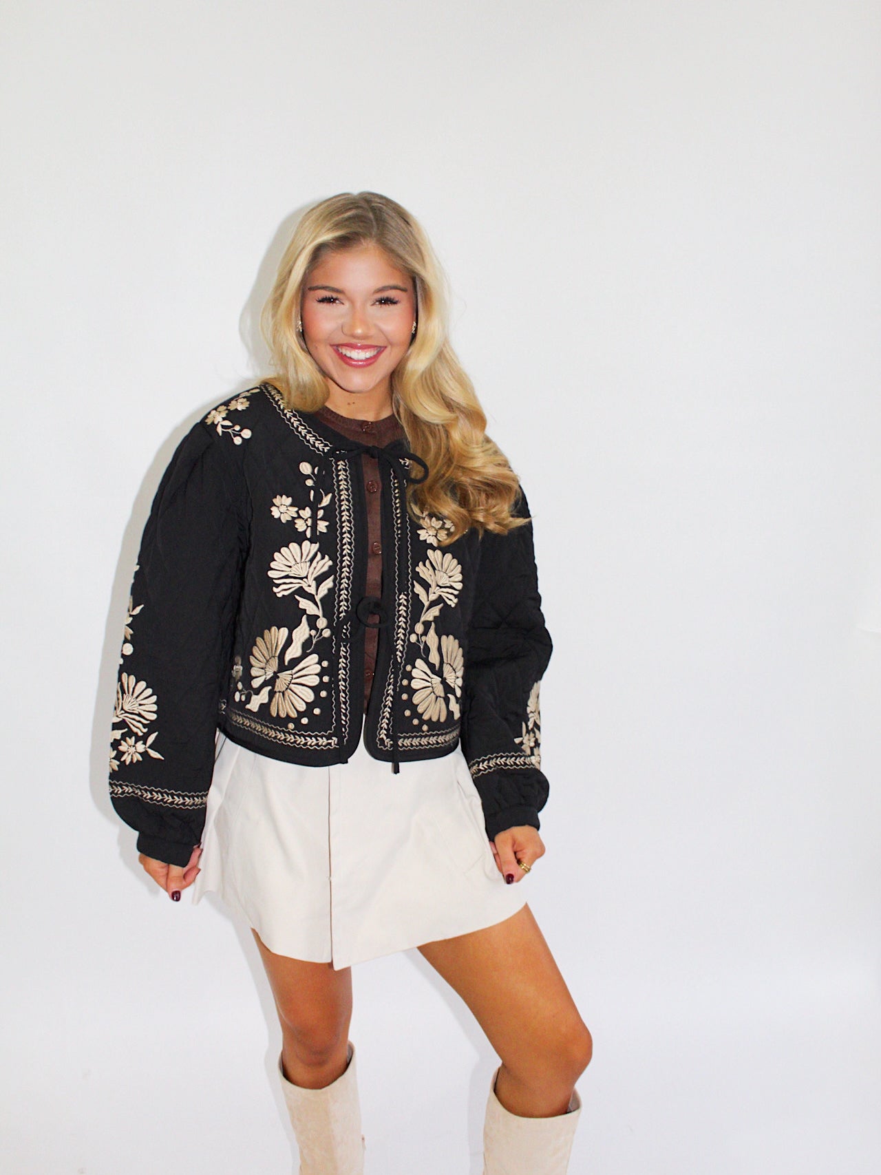 Embroidered tie front quilted jacket